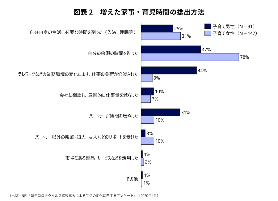 1:新型コロナウイルス感染拡大前と比較して、1日あたりに家事・育児に費やす時間の変化)。増えた家事・育児の時間の捻出方法について、男女共に一番多い回答は「自分の余暇時間を削った」であり、女性は78%、男性も47%となっている。また、男性の44%が「テレワークなどの業務環境の変化により、仕事の負荷が低減された」と回答しており、テレワークなどで長くなった在宅時間を家事・育児に充てていることが確認される。他方、男性の31%は「パートナーが時間を増やした」(女性は10%)と回答しており、女性に負担が偏りがちと考えられる。さらに、女性の10%が「パートナー以外の親戚・知人・友人などのサポートを受けた」と回答しており(男性は3%)、パートナーから得られなかった支援を親戚などにお願いしてカバーしている可能性がある(図表