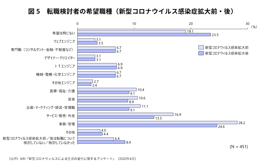 転職検討者の希望業界・職種について、感染拡大前後での変化をみると、業界では、サービス系が▲5.1%ポイント(23.1%→18.0%)と最も下落幅が大きく、次いでメーカー系が▲4.3%ポイント(12.9%→8.6%)となった。他方で、「希望は特にない」と回答した人の割合は感染症拡大前後で+4.6%ポイント(23.3%→27.9%)と最も上昇幅が大きかった(図4)。職種については、事務・管理が▲3.6%ポイント(28.2%→24.6%)、サービス・販売・外食が▲3.4%ポイント(16.9%→13.5%)と下落していた。他方で、「希望は特にない」と回答した人の割合は拡大前後で+4.4%ポイント(19.1%→23.5%)と、希望業界同様に最も上昇幅が大きかった(図5)。