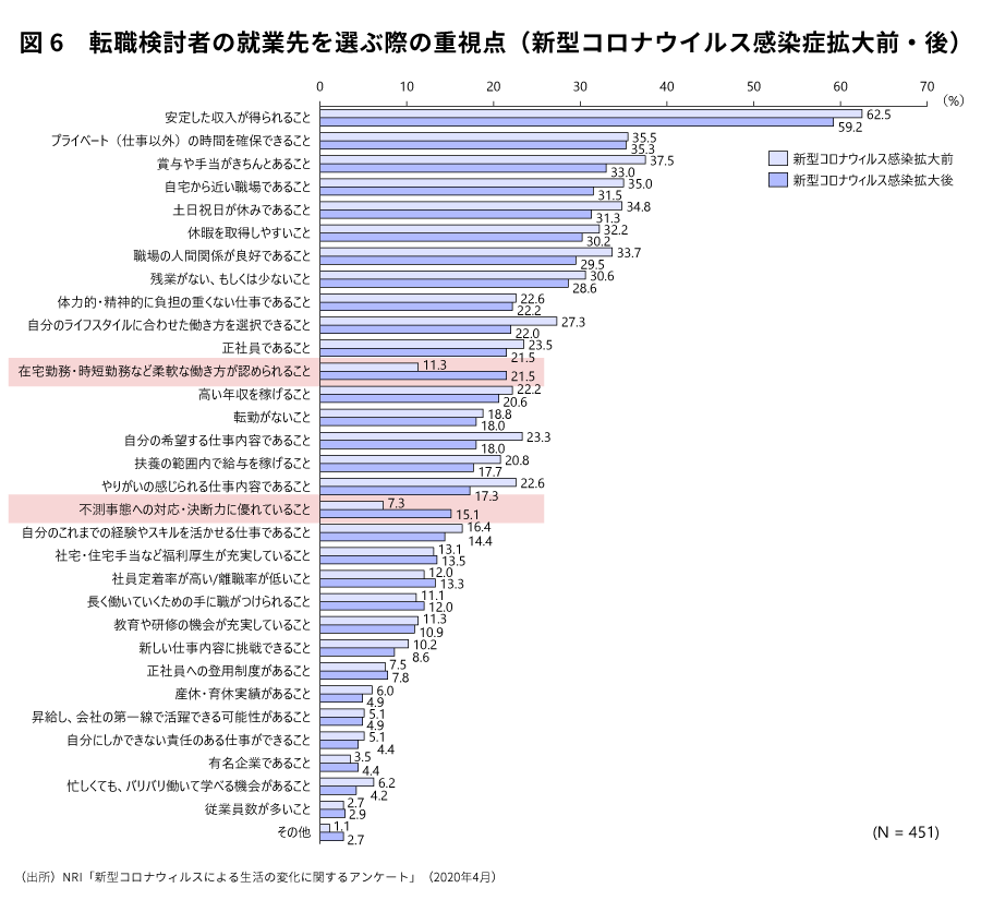 また、採用される人々の就業先企業を選ぶ際の重視点も大きく変化しており、「在宅勤務・時短勤務など柔軟な働き方が認められること」と回答した人の割合は感染拡大の前後で+10.2%ポイント(11.3%→21.5%)、「不測事態への対応・決断力に優れていること」は+7.8%ポイント(7.3%→15.1%)と大きく上昇していた(図6)。今回のコロナショックによって、企業の柔軟性や対応力、決断力が期せずして炙り出されたことで、転職者にとっての新たな企業判断基準が形成され始めたと考えられる。