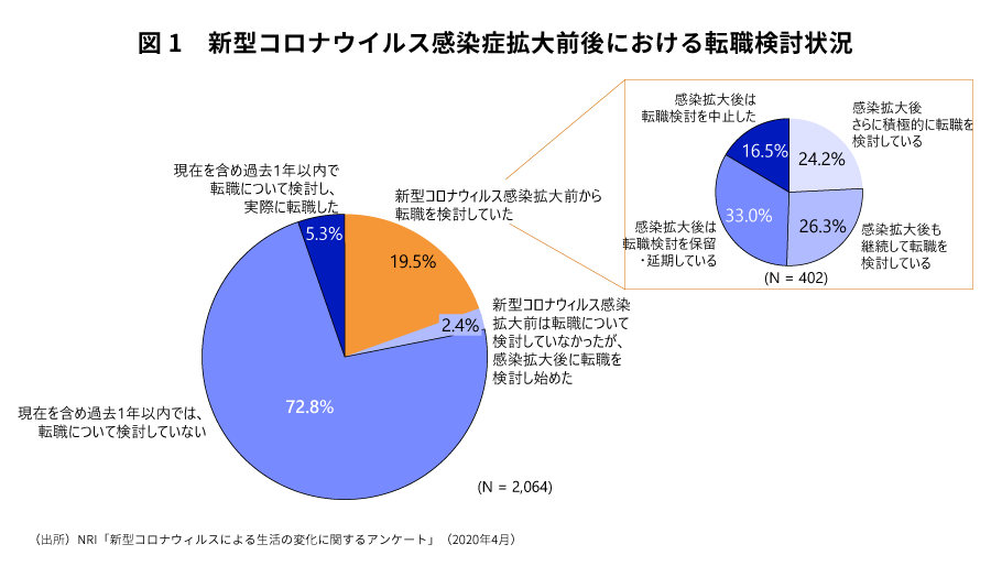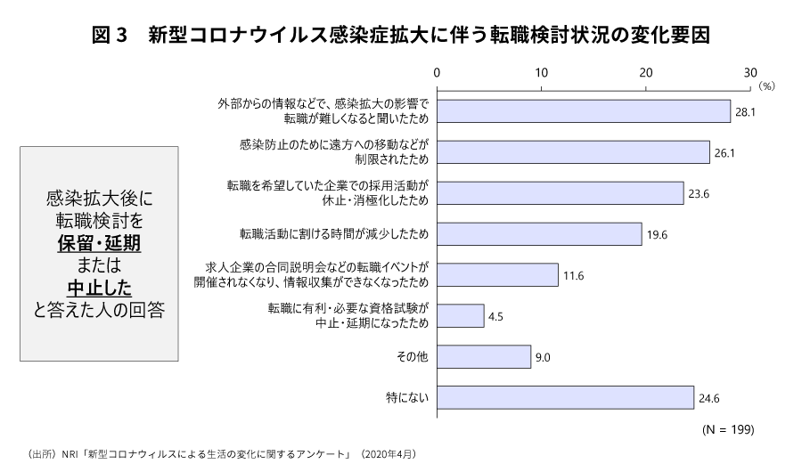 新型コロナウイルス感染症拡大以前に転職を検討していた人のうち、約4分の1は感染拡大後に検討を積極化。他方で、約半数の人は感染拡大後に検討を保留・延期、または中止することから、活況であった転職市場は、短期的には冷え込むことが予想される