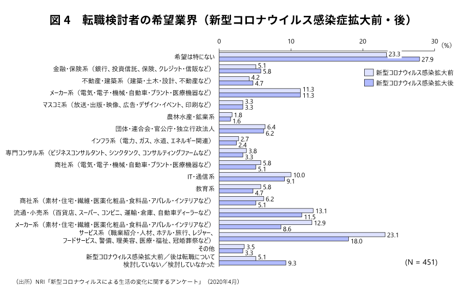 業界・職種ともに、サービス領域をはじめとした人と人との接触を伴う仕事への影響が顕著であり、こうした業界・職種への抵抗感・危機感が大きく表れているものと考えられる。また、「希望が特にない」と回答した人の割合が上昇していることから、より早急な転職決定を望む傾向が強まっているだけでなく、現業の業績悪化等に伴い転職せざるを得ない労働者が増えた可能性も伺える結果となった。
