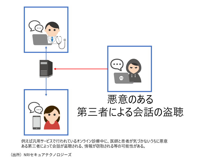 本来、病院で医師の診察を受ける場合は密室であり、基本的には医療従事者と患者のみの空間であるが、オンライン診療では別々の空間にいる医師と患者が通信で繋がれている。オンライン診療に使用されるシステムの通信が暗号化されていない場合、第三者が通信に侵入する可能性がある。