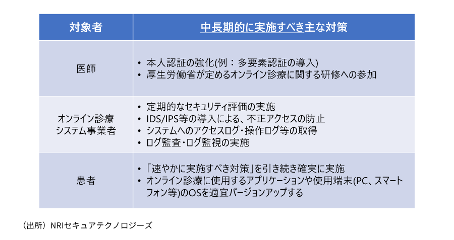 この度の時限的・特例的取り扱いを機にオンライン診療のメリットが広く社会に共有されれば、新型コロナウイルス収束後もオンライン診療の利用は拡大していくだろう。そのような将来を見据えた場合、技術的な対策を含めた、より中長期的な視点からの対策が必要となる。中長期的に実施すべき対策としては、主に以下のようなものが考えられる。