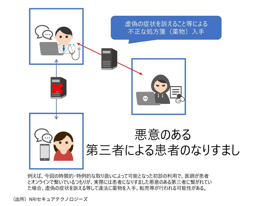 これにより、悪意のある第三者による会話の盗聴や、偽装されたサイトに繋がれることによる医師や患者のなりすまし等が起こり、医療情報の窃取や、違法な薬剤の入手といったリスクがある。