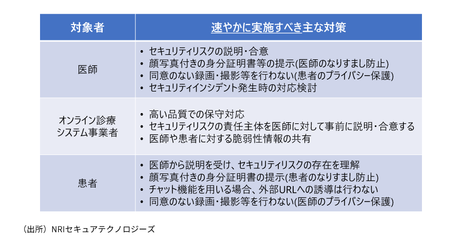 もちろん、本来であれば、上記指針に記載されている全ての対策が、速やかに実施されるのが望ましい。しかし、医療を取り巻く状況に日々変化が見られるような現状においては、セキュリティリスクについては特に重要な事項にのみ焦点をあててスピーディーな対応を実施し、新型コロナウイルス感染拡大や慢性疾病の進行等の他のリスクを同時に低減することが肝要である。そこで以下では、上記指針に記載されている対策や追加で必要と考えられる対策を、「速やかに実施すべき対策(時限的・特例的取り扱い下においても実施すべきと考えられる対策)」と「中長期的に実施すべき対策」に分類して記載する。オンライン診療の利用/提供にあたっては、医療全体に関する様々なリスクも勘案しつつ、セキュリティリスクの低減については下記を参考にしていただきたい。