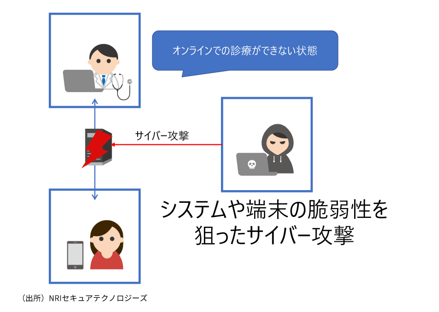 オンライン診療に使用されるシステムや端末に脆弱性 ※13 があった場合、その脆弱性を突いたサイバー攻撃が起こり、マルウェアに感染することでオンラインでの診療が継続できなくなる可能性がある。