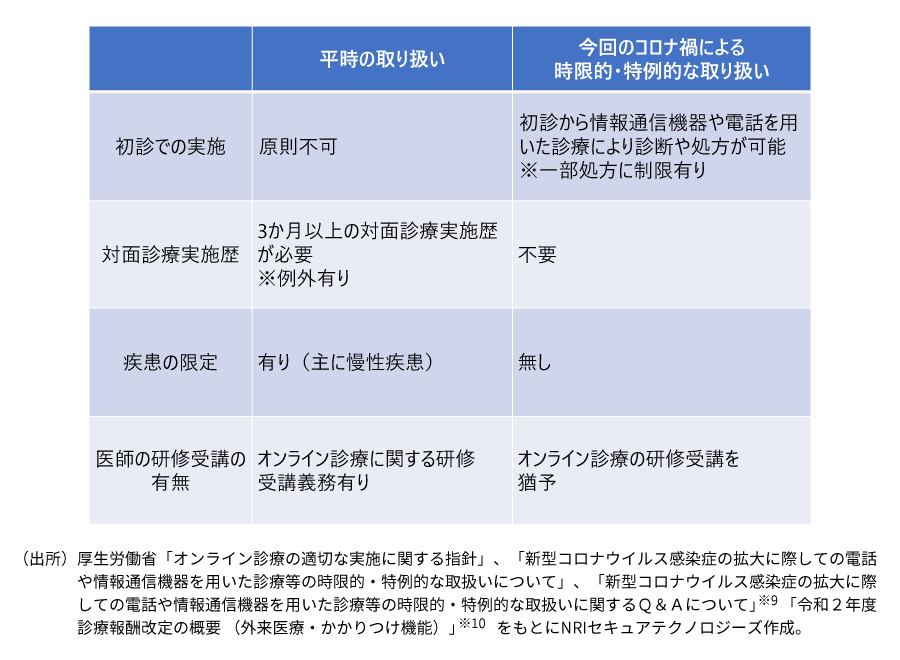 - 新型コロナウイルスの感染拡大をきっかけに我が国でも、従来は様々な制約があったオンライン診療について、初診での利用が時限的・特例的に可能になる等、医療のデジタル化に追い風が吹いている。