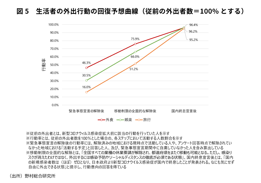 外食・娯楽においては、生活者の直近での外出再開意向が高まってきており、また、次のステップである「移動制限の全面的な解除」後の時点には、従前通りに外食・娯楽での外出を行う生活者が、それぞれ75.9%、66.0%と一定の水準にまで回復する見通しである。(図5)