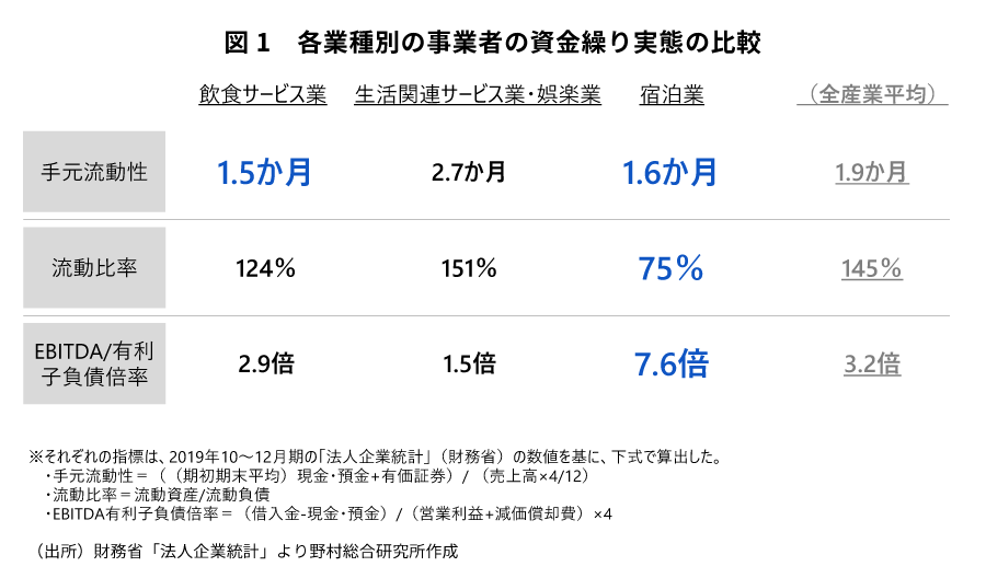 統計によると、前述3つの業種に相当する「飲食サービス業」、「生活関連サービス・娯楽業」、「宿泊業」は手元流動性が低い(手元資金が薄い)事業者が多いことがわかる。手元流動性比率(=月商の何か月分の資金があるか)においては、特に外食関連業種(飲食サービス業)では1.5か月、旅行関連業種(宿泊業)では1.6か月と短く、生活者の外出自粛により売上が立たない期間が生じると資金ショートを起こしやすいことが予想される。中でも宿泊業はさらに事態が深刻であり、現金化が比較的容易な流動資産と流動負債の比率を見た流動比率が75%(全産業平均145%)、フリーキャッシュフローの何倍の有利子負債を抱えているかを示すEBITDA有利子負債倍率は7.6倍(全産業平均3.2倍)と、事業規模と比較して負債が過大となっている事業者が多い。