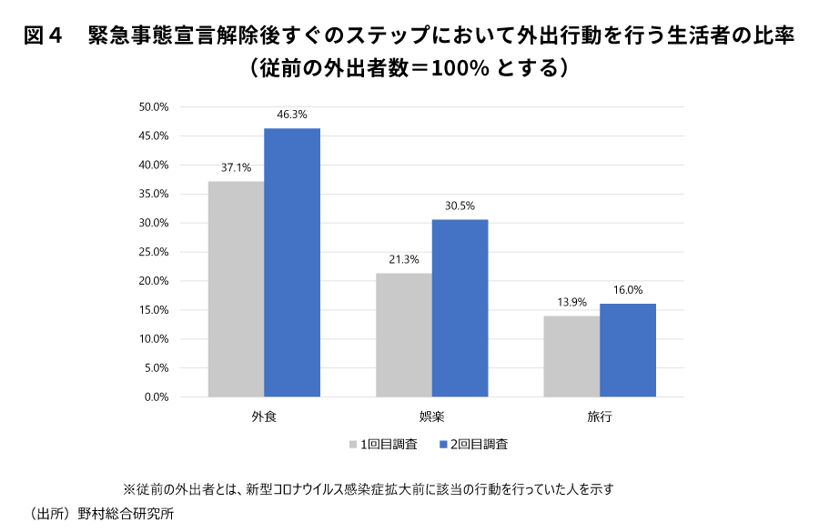 。緊急事態宣言解除時期が早い都道府県ほど傾向は顕著であることから、今後さらに外出意識が高まることも想像できる。(図3)また、「緊急事態宣言解除後すぐのステップにおいて外出行動を行う生活者」の比率は、外食、娯楽においてはそれぞれ46.3%(9.2ポイント増)、30.5%(9.2ポイント増)と上昇した。しかし、旅行においては、16.0%(2.1ポイント増)と低調のままである