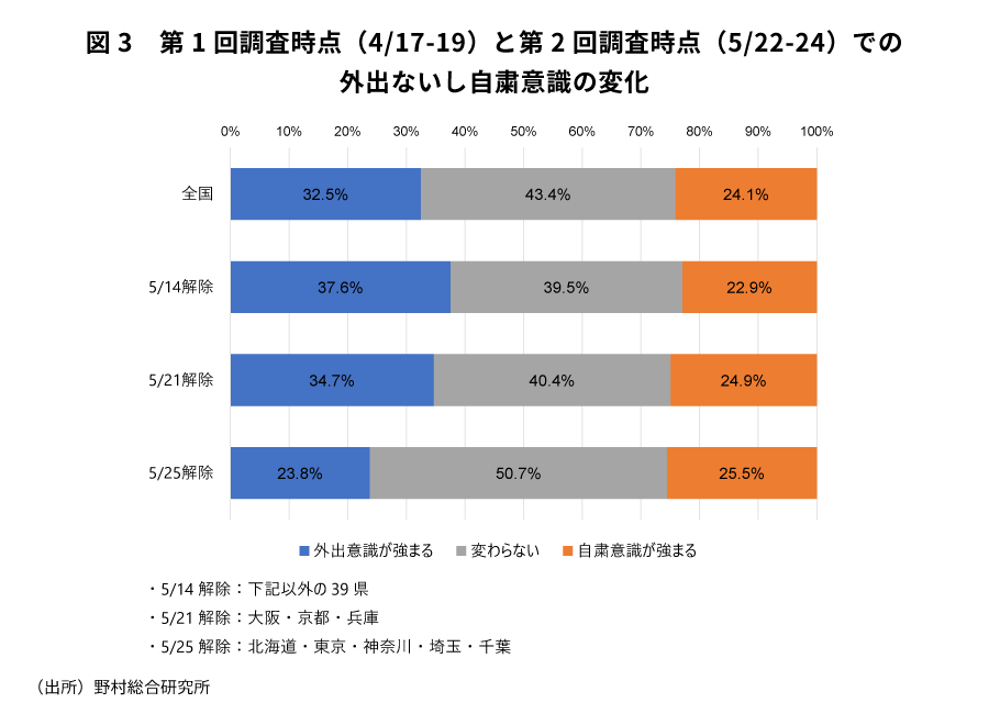 野村総合研究所(NRI)のインターネットアンケート調査(第1回:4月17~19日実施、第2回:5月22~24日実施)により、このひと月の間の外出再開意向の変化を分析した。その結果、外出意識が高まった生活者(32.5%)の方が、自粛意識が高まった生活者(24.1%)よりも多くみられた