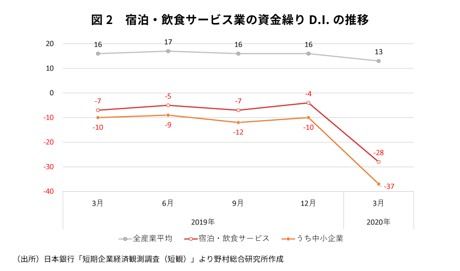 また、2020年4月に公表された日銀短観の資金繰りD.I.によると、直近の1~3月期の「宿泊・飲食サービス業」の資金繰り判断(「楽である」-「苦しい」の指数)は-28ポイント、中小企業に限ると-37ポイントと、前四半期(それぞれ-4ポイント、-10ポイント)と比較して大きく下落した。(図2)