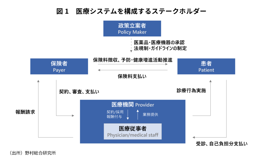 医療システムは、5つの「P」から始まるステークホルダー、すなわち政策立案者(Policy Maker)、保険者(Payer)、医療機関(Provider)、医療従事者(Physician/medical staff)、患者(未罹患者も含む)(Patient)が、それぞれお互いに果たすべき役割・機能を発揮しあうことによって成り立っている。