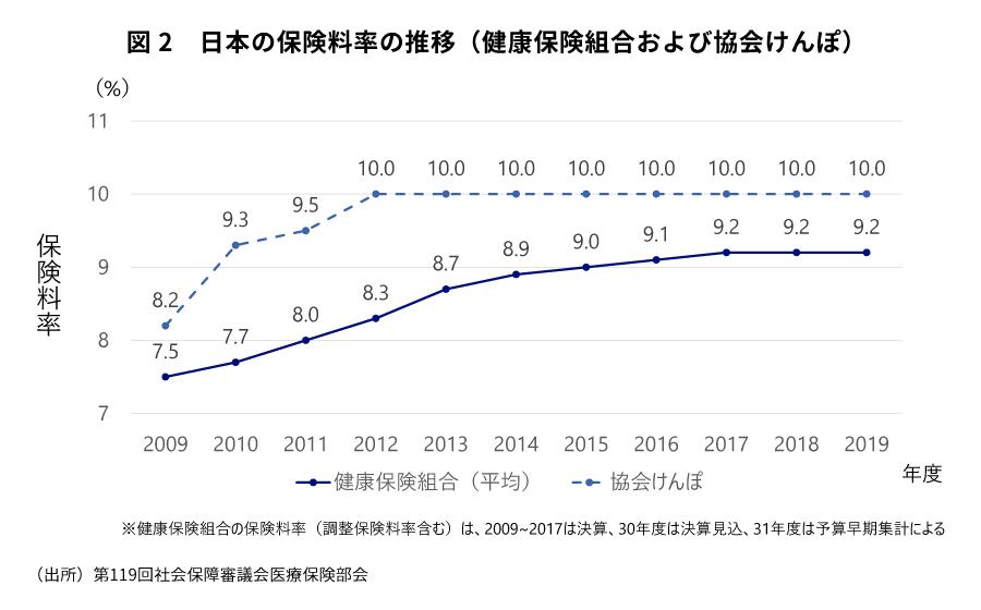 保険者が十分な機能を果たせていない日本では、被保険者たる国民は、罹患・重症化予防へのインセンティブ/ペナルティも無いまま全員が同じ保険料体系の下、受けられる給付サービスは高く維持されたまま、誰もがどこでも医療を受けられるようになっている。このことは日本の医療システムの優れた点として語られることが多い。一方で、高齢化が進んできた中で保険者は、被保険者の罹患・重症化リスク、ひいては医療需要を抑える効果的な施策を打てておらず、その結果が保険料率の上昇という形で表れている。