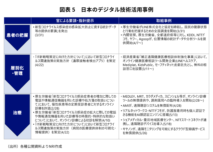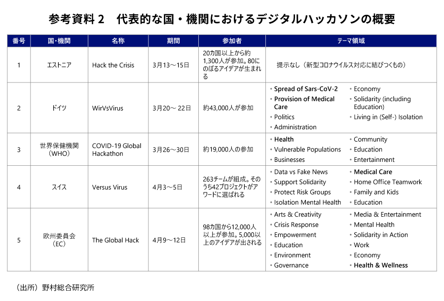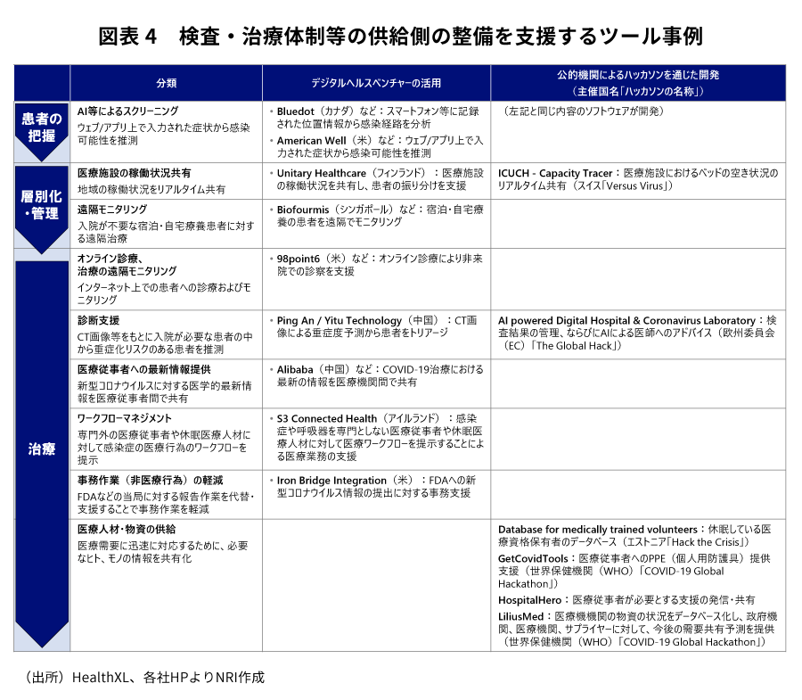 - また、世界各国はデジタル技術を活用し、医療提供体制を補完している。患者の把握、層別化・管理、治療を効率化するために、ベンチャーの既存技術を医療分野に展開する事例やコロナ禍によって顕在化した新たな課題の解決方策を開発するために、政府主導でハッカソンを実施するなどしている。日本でも民間IT企業と連携した複数の取組みが3月末から開始されており、今後の社会実装が待たれる。