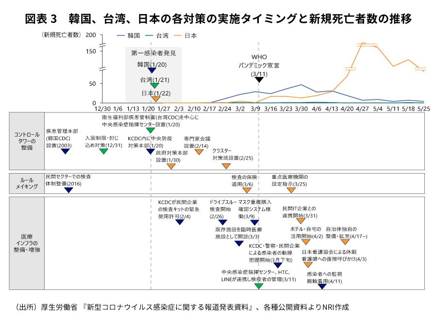 日本が行っている対策を、前述の①コントロールタワーの整備、②ルールメイキング、③医療インフラの整備・増強の3つの側面と対策実行のタイミングから整理をした(図表2)。日本でも、他国と同様にコントロールタワーの整備や医療インフラの整備・増強を行っているが、対策の実施タイミングが他国と異なることがわかる。他国では平時に、有事の意思決定構造を明確化し、対策を円滑に実行するためのルールを作り、現場のオペレーションを定め、医療インフラの整備・増強を実施することで、患者の「把握→層別化→管理→治療」の一連の流れを迅速に回せる仕組みを構築していた。例えば、韓国、台湾は、感染発生前に①コントロールタワーの整備、②ルールメイキングを終えていたことで、感染発生後は、③医療インフラの整備・増強の実効策にフォーカスした施策を矢継ぎ早に実施することができ、死者数の拡大を防ぎ収束に繋げた(図表3)。日本は、感染症発生前に他国のような仕組みが十分整備されていた状況ではなかったため、感染症発生後のタイミングで多数の対策について検討する必要が生じた。