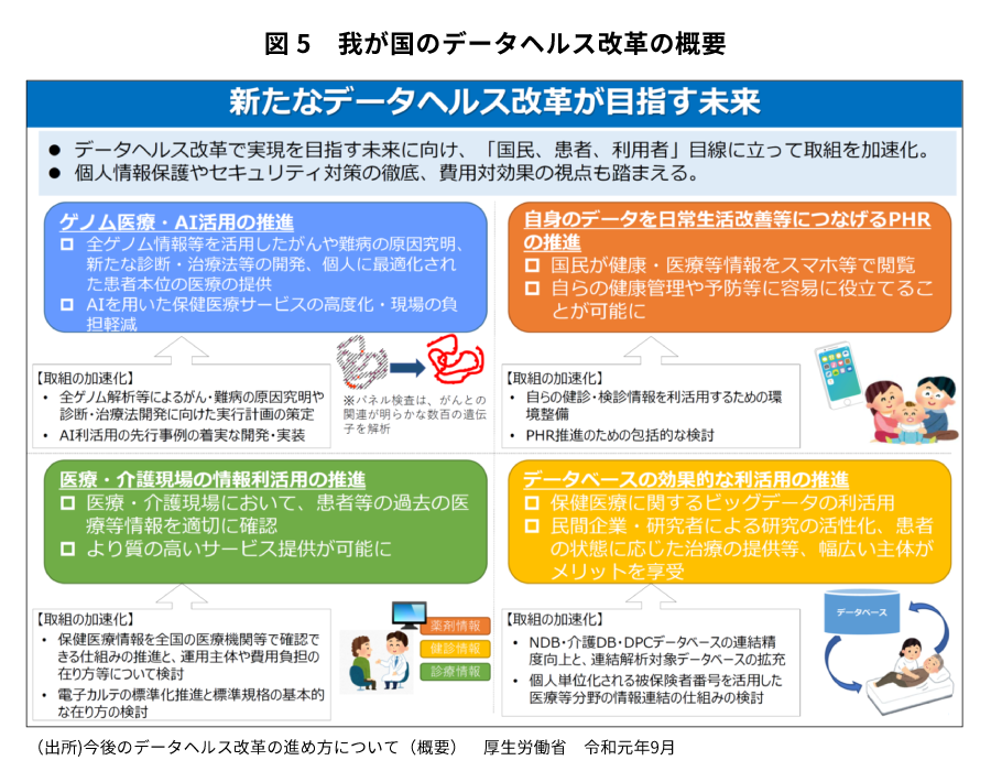 我が国も将来的には健康・医療情報プラットフォームの整備、利活用が期待できる。我が国のデータヘルス改革では、図5に示すように、EHRに相当する医療・介護現場の情報利活用の推進やPHRの推進、研究のためのデータベースの活用やAI活用の推進などが進められている。加えて、健康・医療情報の標準化や個人の医療IDとして個人単位化された被保険者番号による情報連携なども検討されている。将来的にこの取り組みが実現すれば、我が国が医療・情報プラットフォームの先進国の一員になることも期待できるだろう。