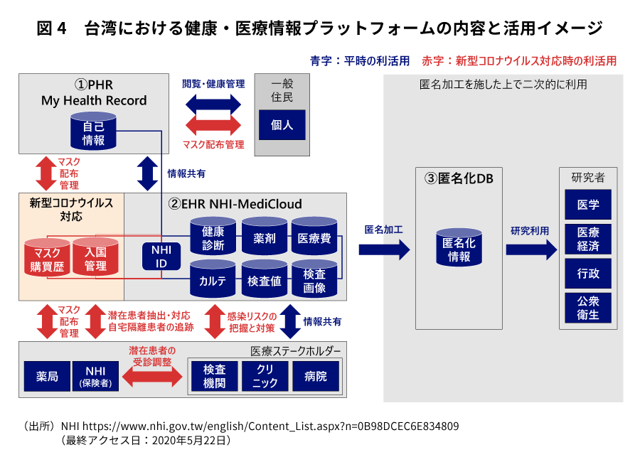 - 台湾は、新型コロナウイルスへの優れた対応例として各国から注目を集めているが、このような取り組みは、台湾がかねてから整備を進めてきた健康・医療情報プラットフォームの利活用によって実現した。