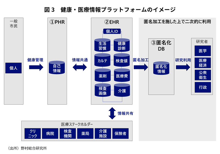 健康・医療情報プラットフォームは、医療ステークホルダー間の情報共有のためのEHR(Electronic Health Record)、患者とステークホルダー間の情報共有のためのPHR(Personal Health Record)、及び公衆衛生や医学研究を行うための匿名化データベース(匿名化DB)の3つの要素で構成され、これらが合わさって医療の質の向上に貢献する。