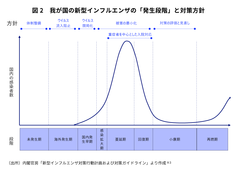 新型インフルエンザ等の感染症に対しては、図2に示す通り、WHOによるパンデミックインフルエンザ警報フェーズとは別に日本独自の表現と対策方針が設定されている。今回の新型コロナウイルスに対しても本考え方を前提に、「社会・経済機能への影響を最小限としながら、感染拡大防止の効果を最大限にする」という方針のもと対策が実施されてきた ※1 。海外発生期から国内発生早期においては「国内侵入防止」に力点が置かれ、医療体制を構築するための猶予を持つことを目的とした。また、感染拡大期では、クラスター対策を基本とした。これは、集団発生による「感染拡大防止」を実施し患者増加のスピードを抑え、ピークを下げることで医療崩壊の防止を目的としたものである。そして、蔓延期では重症化予防や層別化により、重症な患者に適切な医療リソースが配分されることを目的として対策を行ってきた。
