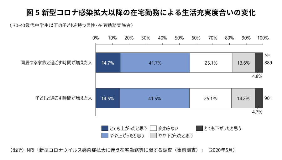 子どもとの時間が増えたという結果については、感染防止による臨時休校・登園自粛などが重なったこともあり、育児の負担増を意味するという解釈もできる。しかし、同居する家族や子どもと過ごす時間が増えた人で、生活充実度合いが「下がった」とする人は少なく、逆に生活充実度合いが「上がった」と回答した人が5割を上回った。(図5)通勤自粛により在宅勤務を余儀なくされたが、結果として家族・子どもと過ごす時間が増えたことで、生活充実度合いがこれまでよりも上がったと感じた子育て期の男性が多かったことが推察される。