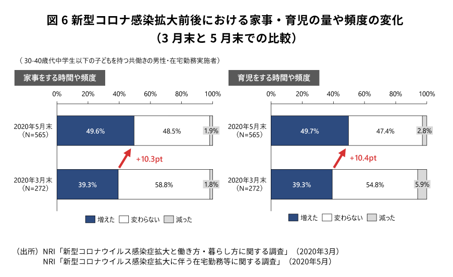 同じく、在宅勤務を行った子育て期の男性の新型コロナウイルス感染拡大前後における家事・育児の量や頻度の変化をみてみると、およそ2人に1人が「家事をする時間や頻度が増えた」「育児をする時間や頻度が増えた」と回答した。3月末の調査結果よりも、それぞれ10ポイント上昇している。(図6)