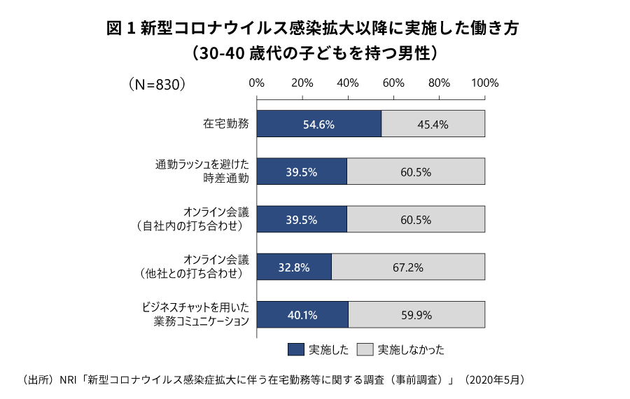 子どもを持つ30~40歳代の男性のうち、54.6%が新型コロナウイルス感染拡大以降、在宅勤務を実施したと回答した