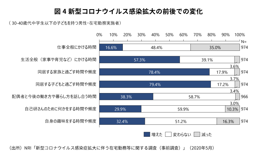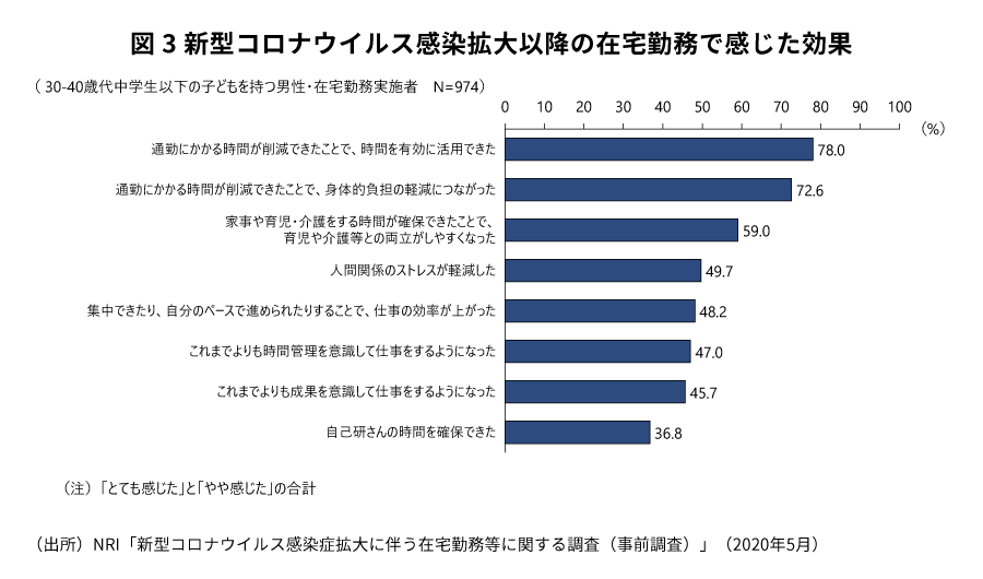 - 新型コロナウイルスの感染拡大は、男性を例外とせず、我が国の多くの人の働き方を急変させた。