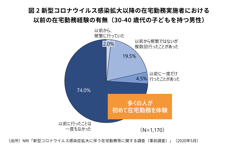 。また、在宅勤務実施者のうち74.0%が、「新型コロナウイルス感染拡大以降、初めて在宅勤務を実施した」と回答した。子育て期の男性も例外なく、働き方を急変させたことが分かる。(図1、図2)