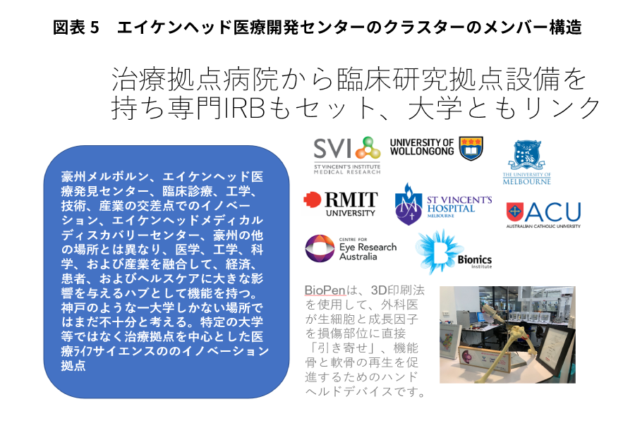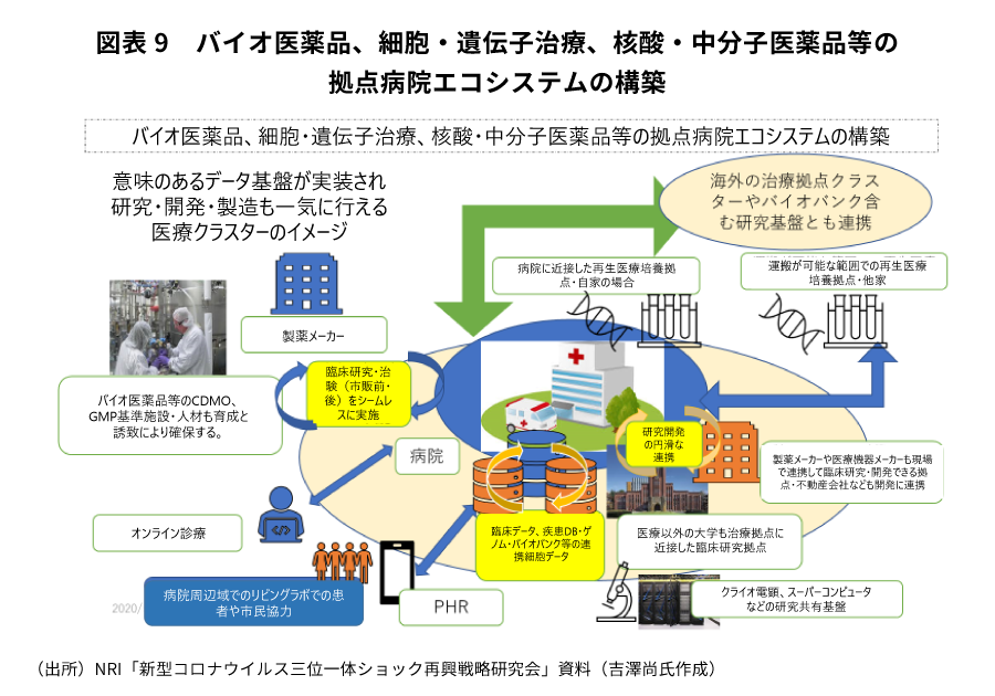日本においても、先端医療研究拠点を治療拠点として関連産業、大学も連携させるべきである。前述のような豪州、英国などの創薬や医療機器の開発、そして市民の健康医療をデジタル技術で守るイノベーションの拠点をしている事例 ※5 を参考に我が国の臨床研究中核病院や一定規模の拠点病院を中心にこのような環境を整備し、より良い医療サービスを共に作っていくインフラを形成し、拠点を窓口として、医療先進国として、グローバルヘルスに貢献し、投資をも呼び込める地域社会と一体となった国際的な先端的医療研究・産業集積拠点を作っていくことをメディカルニューディールとして提言したい。
