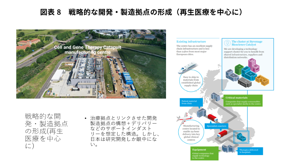 分野毎に如何なるサプライチェーンやエコシステムが必要かを留意した上で、例えば、再生医療の培養拠点、運搬などのサポートインダストリーの支援、バイオ医薬品のCDMOの育成
