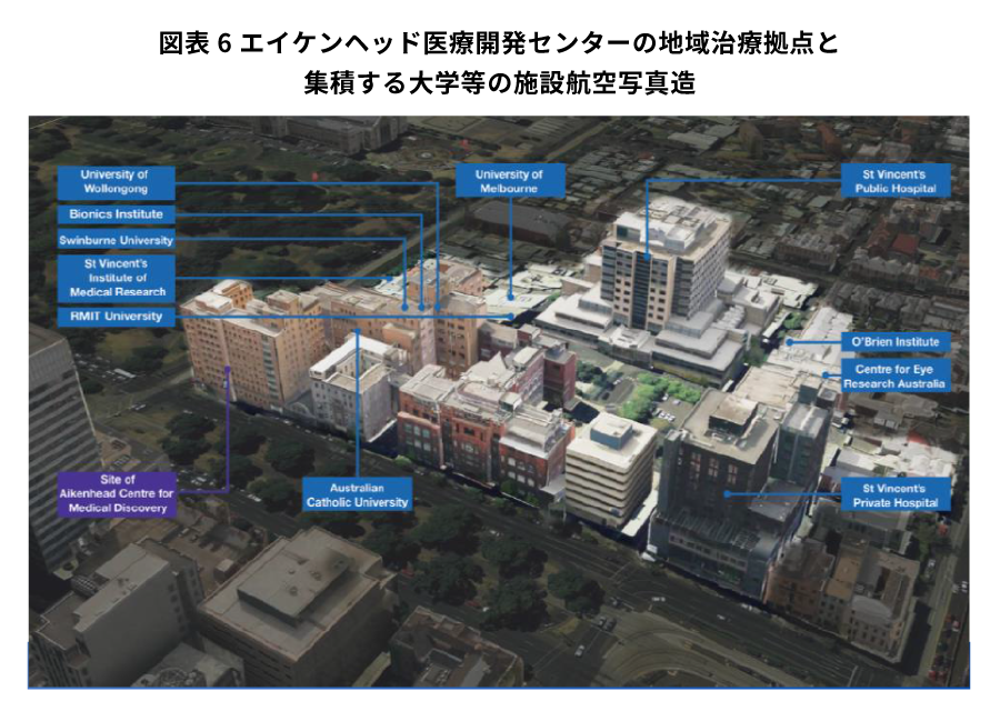 以下の図の豪州のアイケンヘッド医療開発センターなどでは、治療拠点となる大学病院や、臨床研究中核病院、国立の各種医療センターなどを中心に、各種関連研究を行っている、情報系、工学系、医学系、生命科学系の大学の研究室、不動産事業者、製薬メーカ、医療機器メーカ、専門性のある投資家、各種関連産業を集積させた。創薬や医療機器の研究開発のみならず、住民中心の高度な健康管理に注力したまちづくりを実践し、市民参加型で、PHR(Personal