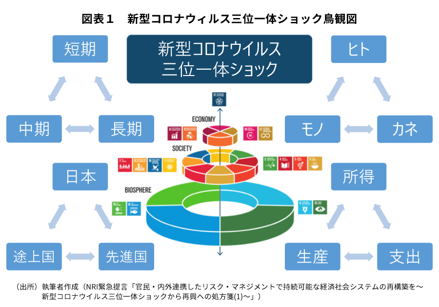 執筆者が英国ロンドンで王立国際問題研究所(チャタムハウス)客員研究員やG7、G20担当をした際にご縁のあった日本・先進国・途上国で活躍する有志がNRIにリモートで集い、「新型コロナウイルス三位一体ショック再興戦略研究会」で再興への処方箋を議論する中で、