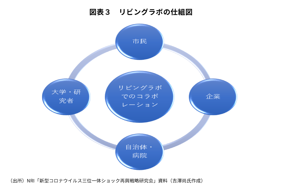 リビングラボはユーザー中心のオープンイノベーションであり、参加型で新たなインフラを市民が開発に意見を出していく仕組み。JCなどの団体の支援を受けて開業医などのメンバーに協力を募り活動する動きを提示してもよかろう。プライバシーの課題も初めから否定するのではなくシステムの設計に意見を出して改善する取り組みを行う場所として市民が参画して行く場を作るのも一案である。