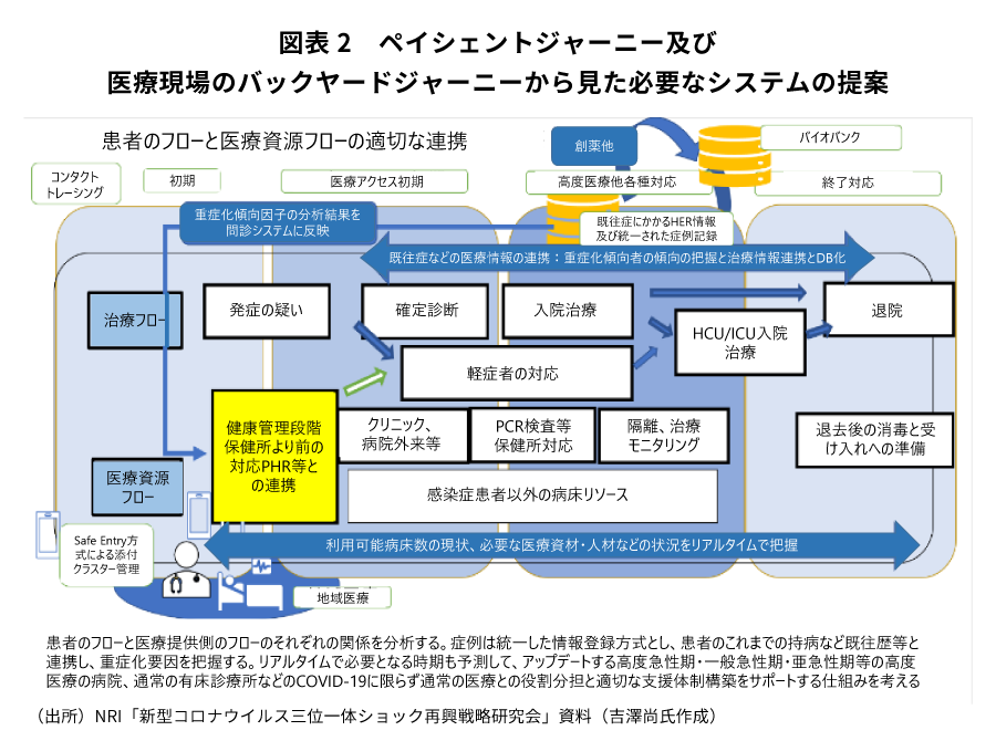国民の生命・健康を守るために実施すべきは、図1のように臨床現場の課題を解決するシステムであり、ペイシェント・ジャーニーと集中治療供給体制に至るまでの医療現場のフローの双方から課題とニーズ分析するための、患者の症例情報・電子カルテ情報、医療現場の稼働状況、必要な医療資源の流通、在庫の確保に足るまで医療情報及び稼働状況、必要な医療資源の情報を連携させたシステムの構築を検討すべきである。