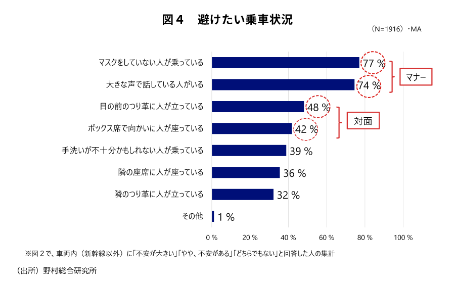 避けたい乗車状況は、70%以上が「マスクをしていない人が乗っている」や「大きな声で話している人がいる」などの“マナー違反”を挙げ、40%以上が「目の前の吊革に人が立っている」、「ボックス席で向かいに人が座っている」などの“対面”を挙げた。(図4)