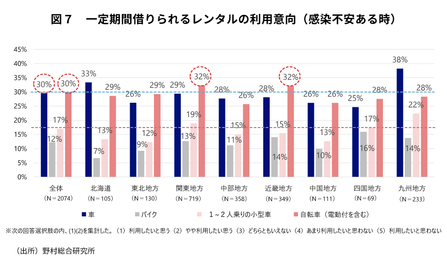 それに対し、感染不安がある時、鉄道の利用意向は57%から22%に減少、バスも45%から14%へ減少する。一定期間借りられる月額定額制などのレンタル制度の利用意向は「車」「自転車」とも30%で、鉄道やバスを抜いた。また、車より利用の壁が低いと思われる自転車の利用意向は、関東や近畿で高い傾向となっている。(図7)