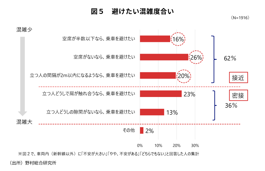 “隙間がない”になった時、約62%が“空席がない、または半数以下”、“立っている間隔が2m以内”なら乗車を避けたいと思っていることが分かった。(図5)
