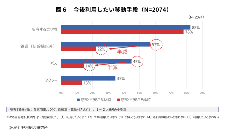今後、感染不安があると、鉄道・バスの利用意向は半減