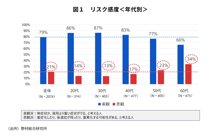 公共交通機関は、様々なリスク感度をもつ不特定多数の人が同時に同じ空間を共有する。そのため、新型コロナウイルスに感染した場合、どのような状態になると思うかを聞いたところ、「無症状か風邪より重い症状がでる」と考える人(以下、「楽観派」と呼ぶ)が79%、「後遺症が残ったり、重症化や重篤化する可能性がある」と考える人(以下、「悲観派」と呼ぶ)が21%存在した。20代~40代では悲観派は20%以下だが、50代60代では20%以上であった。(図1)