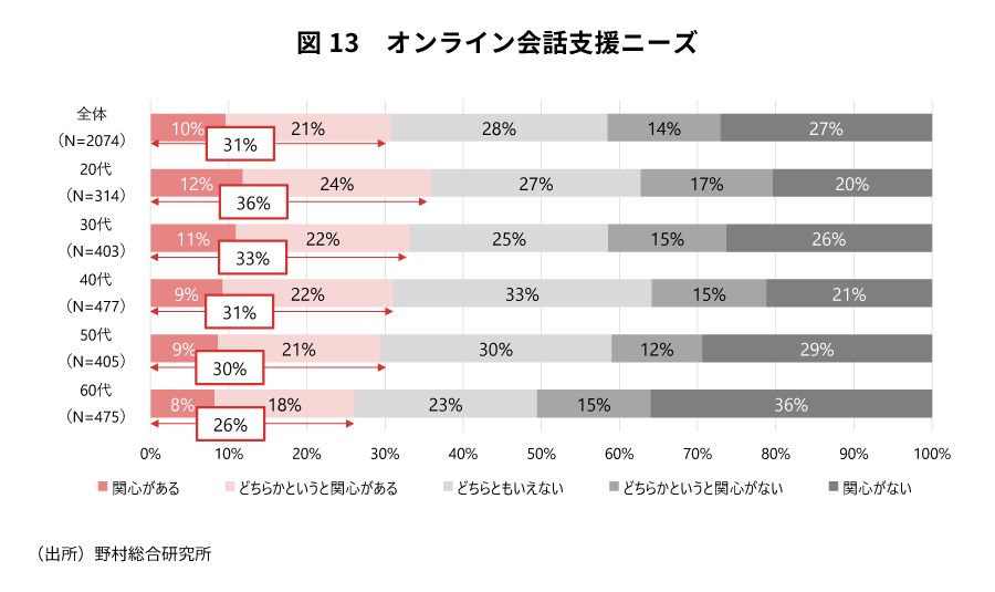父母・祖父母の自宅の近場(30分以内で行ける距離)にある個室スペース(感染症対策済)で、父母・祖父母が自分とのオンライン会話のために、ネット接続支援をしてもらえるとしたら、関心があるかを尋ねた。近場とは、父母・祖父母が自転車や鉄道で30分程度で行ける程度の距離を指す。結果、全体の31%が関心を示し、年代が若くなるほど関心を示した。(図13)