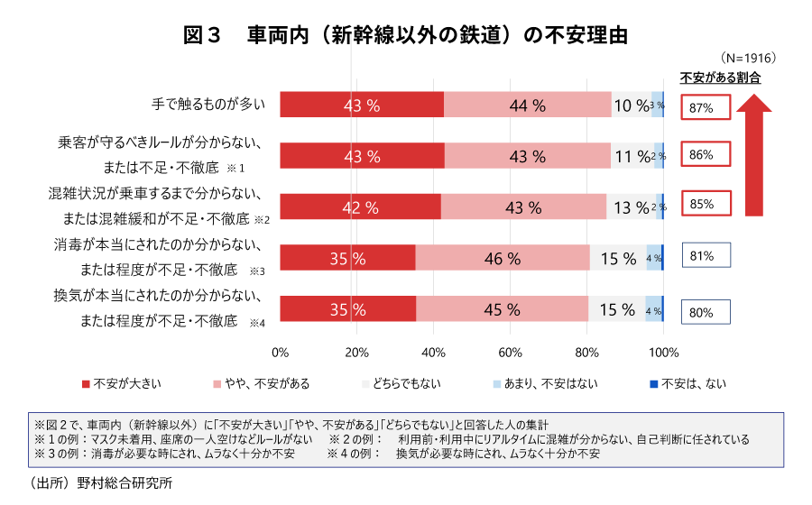 鉄道車両内に明確に不安がないと回答した人以外に具体的な不安理由を聞くと、85%以上が「手で触るものが多い」、「乗客が守るべきルールが分からない、または不足・不徹底」、「混雑状況が乗車するまで分からない、または混雑緩和が不足・不徹底」の3点を挙げた。(図3)