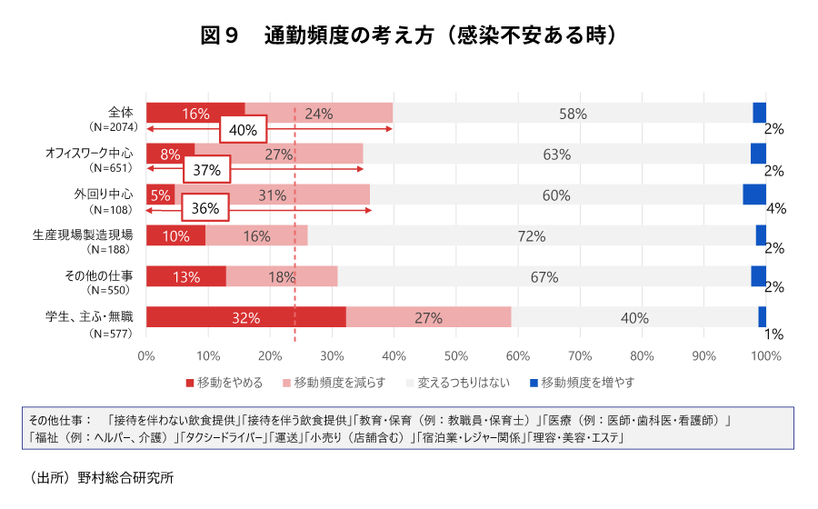 今後、感染不安がなくなると、全体の38%が公共交通機関を利用して「週4回以上」通勤すると考え、特に「オフィスワーク中心」や「外回り中心」の人の場合、55%以上となる。(図8)しかし、ひとたび感染不安を感じると、全体の40%が移動をやめたり減らし、移動控えが生じる。(図9)