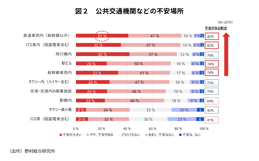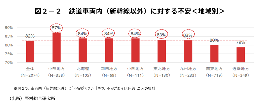 公共交通機関と駅ビルなど関連施設のうち、不安を感じる場所を聞いたところ、41%が「鉄道車両内」で不安の程度が大きいと回答し、やや不安と回答した人も含めると82%となった。(図2)地域別でみると都市部において不安が特に大きいわけではなく、関東・近畿以外は、83%以上の人が不安を感じていた。(図2-2)