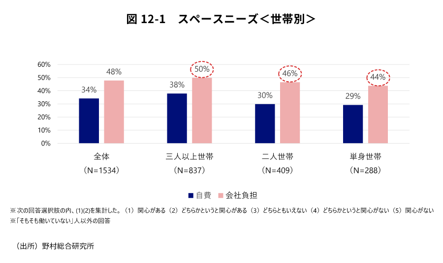 利用料が会社負担の場合、世帯別で比較すると「三人以上世帯」「二人世帯」「単身世帯」を問わず、関心度は44%~50%と高い。年代別では20代~40代が51%~59%が関心を示し、(図12-2)職業別では、「オフィスワーク中心」「外回り中心」の50%以上に関心があった。(図12-3)