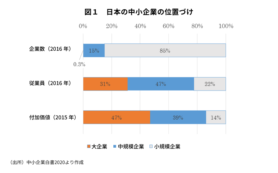 日本の産業組織の特徴は、中小企業が雇用と付加価値を支えていることである。中小企業(中規模企業と小規模企業の計)に所属している従業者数は日本企業全体の69%、中小企業が生み出す付加価値額は全体の53%と過半となっている(図1)。このような中小企業に経済、雇用を依存する日本の産業組織構造が、コロナ問題の影響を深刻化させているのである。
