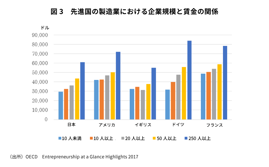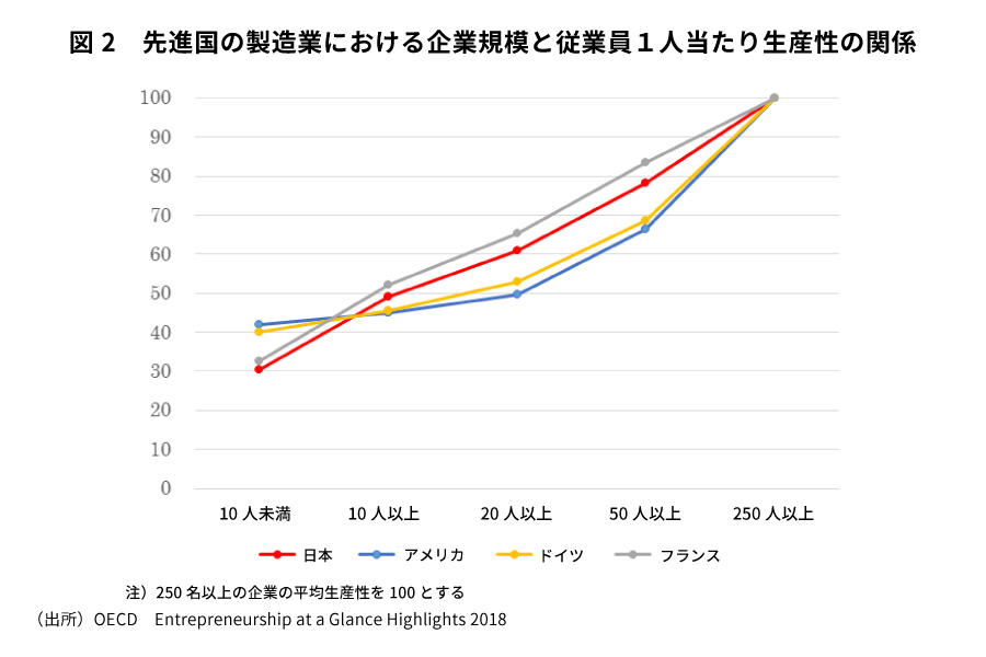 製造業を例にとると、日本の場合、他の先進国と比較して企業規模が拡大すると生産性がより線形的に増加する関係にある(図2)。