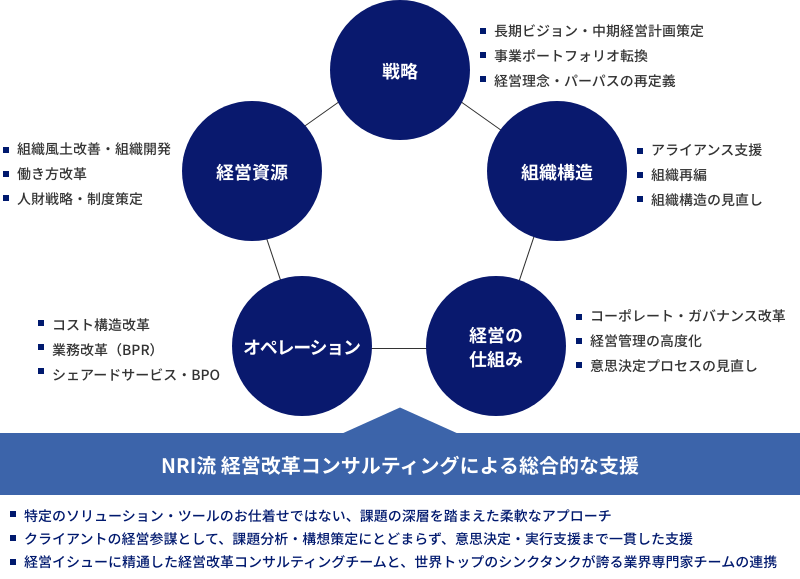 NRIの経営改革コンサルティングチームは、改革の大義づくりや構想策定から実行に至るまで、クライアントに寄り添い改革を一緒に実現していく経営参謀として、難易度の高い経営改革を支援し、クライアントの持続的な成長に貢献します。
