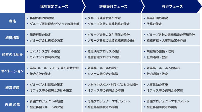 事業環境の変化に適応するために、複数の企業グループ同士による経営統合や、国籍・業種を超えたM&Aが増えています。しかし、経営の仕組みやオペレーション、組織文化が異なる組織の融合に失敗し、再編・買収の効果を発揮できていないケースが多いのが実態です。NRIは、組織再編に伴う組織、経営・ガバナンスの仕組み、オペレーション、経営資源の各テーマにおける課題解決のための専門チームに加え、再編プロジェクト全体を統括するPMO(プロジェクトマネジメントオフィス)もハンズオンで支援しています。