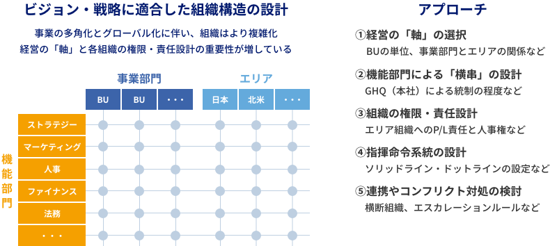 組織構造には、さまざまな選択肢があります。カンパニー制にすべきか持株会社体制にすべきか、またビジネスユニットを製品別にすべきか地域別にすべきか―これらの問いに普遍的な正解は存在せず、それぞれが良い面と悪い面を持ち合わせています。単にビジネス書に書かれた理論や他社事例を真似るだけでは、組織設計はうまくいきません。それぞれの組織が有機的に結合し全体最適を実現できるようにするためには、自社のビジョンや戦略への適合性、置かれた事業環境や企業内部の課題を踏まえ、その企業ならではの指揮命令系統、組織間の連携やコンフリクトへの対処方法を設計することが重要です。NRIは、フロントオフィスからミドル・バックオフィスに至るあらゆる部門、また地域支店や海外拠点の再設計を支援しています。